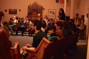 Last night was our annual Thanksgiving celebration! Each year, one week before the holiday, we celebrate Thanksgiving with our community. Parents, staff and their families, alumni, friends, and students gather together for a service followed by a feast! Students lead the service, playing music, reading poetry, and performing a thematic play. Students also contribute to the Thanksgiving meal by preparing food from our Farm to School program. This year, Gus Buchanan, history teacher, and his wife, Kara, guided the action in the kitchen and helped students prepare Creamy Succotash and Roasted Delicata Squash. We were also so glad to welcome back so many of our alumni, including three Champlain College students! We wish everyone a restful and happy vacation!